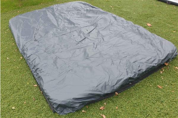 De Akrobat afdekhoes Inground 335x244cm is geschikt voor rechthoekige trampolines op poten en inground trampolines tot 20 cm boven het maaiveld. Door de zware uitvoering ligt de hoes straks op de trampoline waardoor deze niet klappert tijdens een storm. Het materiaal van deze extra zware kwaliteit afdekhoes is zwaar bisonyl zeildoek (vrachtwagen zeildoek). De bevestiging van de afdekhoes gebeurt door een elastisch koord die in de hoes is verwerkt. Dit koord kan om de trampoline worden getrokken en houdt de trampoline afdekhoes op zijn plek. In het midden van de afdekhoes zitten klein gaten. Hierdoor kan water direct wegstromen zonder dat de hoes verder belast wordt.