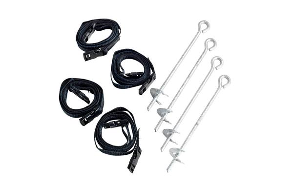 Deze ankerset bestaat uit vier ankers en vier banden voor het verankeren van de trampoline aan de grond. Hierdoor staan de poten stevig en kan de trampoline zelfs met de wildste sprongen niet verschuiven.
