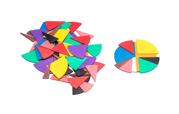 1 volle cirkel (afm. diam. 10 cm) 70 verschillende breuken in verschillende kleuren (1x 1/1, 2x 1/2, 3x 1/3, 4x 1/4, 5x 1/5, 6x 1/6, 8x 1/8, 10x 1/10, 12x 1/12 en 20x 1/20)