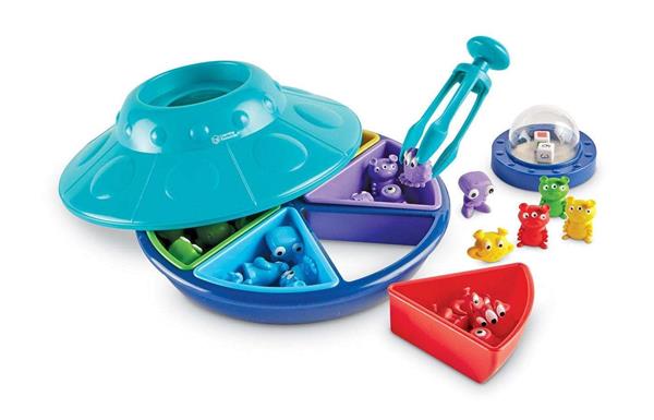 Met dit sorteerspel met buitenaardse wezens ontwikkel je naast sorteren nog verschillende andere vaardigheden zoals tellen, patronen maken, kleuren herkennen en fijne motoriek. Gebruik de Tri-Grip pincet als voorbereiding op een goede pengreep. Duw op de dobbelsteen popper en kijk welke kleur de dobbelsteen aangeeft, sorteer dan de 30 aliens op kleur in de 6 sorteerbakken die in de onderkant van het ruimteschip zitten. De dobbelsteen in de popper kan je ook vervangen door een dobbelsteen met cijfers, zo kan je oefenen op tellen. Heel veel mogelijkheden met dit buitenaardse wezens sorteerspel.