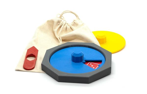 1 basisplaat (afm. 15 x 15 cm) 3 wielen (1/4, 1/8 en een pijl) 3 recto verso standaard kaarten 1 katoenen opbergzakje