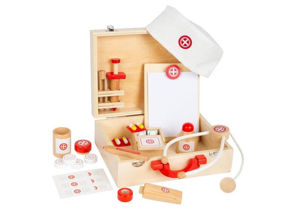 Met deze prachtige houten dokterskoffer zal je menig patiënt snel kunnen helpen. Onderzoek de patiënt en behandel hem met de juiste medicatie, zalf of spuitje. Eindeloos speelplezier verzekerd! Op bestelling.