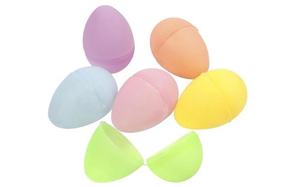 Set van 24 pastelkleurige kunststof paaseieren in 6 kleuren, die kunnen worden geopend en gevuld met kleine voorwerpen. Leuk als decoratie of om te gebruiken bij verschillende spelletjes.