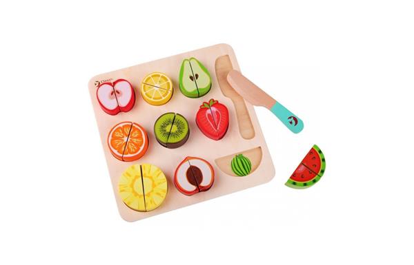 Leuke houten puzzelset bestaande uit 9 stukken fruit die je met het bijgeleverde mes in twee kan snijden. De stukken kunnen weer aan elkaar bevestigd worden door de velcro.