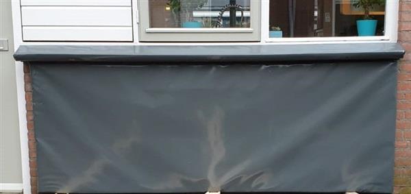 Deze houten platen zijn bekleed met een foam van 35mm dik en hier overheen zit antraciet/ grijs PVC zeil materiaal.