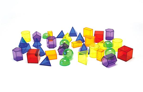 Doorzichtige plastic geometrische bouwblokken. Verschillende vormen en 6 kleuren. Zeer geschikt voor gebruik op de lichttafel.
