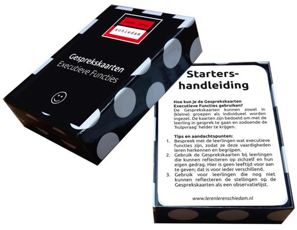 Een inlogcode waarbij je toegang krijgt tot het extra gedeelte op de website www.lerenlerenschiedam.nl , met daarin: - een uitgebreide startershandleiding; - de informatiekaarten als PDF, zodat je deze in A4 kunt printen; - de doorvraagvragen per executieve functie; - een lijst met spellen die je kan gebruiken om de executieve functies te trainen.