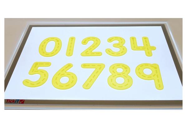 Transparante gele silicone nummers die sterk, zacht en buigzaam zijn. Ze kunnen gebruikt worden in de zandbak, op de vloer, lichtbak en ook in het water. De pijlen geven de richting aan voor de juiste cijfervorming. Deze silicone vormen zijn heel makkelijk schoon te maken, zelfs in de vaatwasser vertonen ze erna geen schade. Winnaar PPS Silver Award 2014