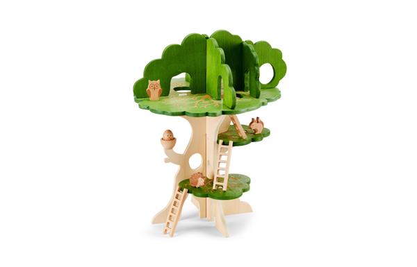 1 boomhut (afm. 55 x 37 x 37 cm) 3 ladders 4 houten dieren
