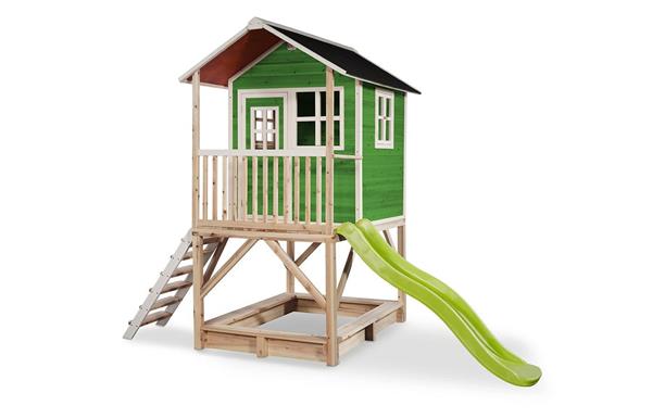 In dit houten speelhuis hoeven de kinderen zich geen dag te vervelen. Dit huis staat op poten en is extra verhoogd zodat kinderen in de zandbak eronder kunnen spelen. Klim omhoog via het trapje en glij naar beneden via de coole glijbaan. Eenvoudig in elkaar te zetten vanwege de vooraf gemonteerde onderdelen.