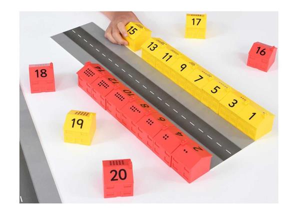 Deze huizenset bevat 2 lange straten en 20 huisjes genummerd van 1 t.e.m. 20. De even nummers hebben een rode kleur, de oneven nummers hebben een gele kleur. Aan de achterkant van elk huisje staat het getalbeeld afgebeeld. Aan elke kant van een straat kunnen maximum 10 huizen naast elkaar gesorteerd worden. Heel veel spelmogelijkheden met deze set. Zowel het tellen als het inoefenen van de even en oneven getallen kan gestimuleerd worden. Ook de helft en het dubbel kan op een leuke manier ingeoefend worden.