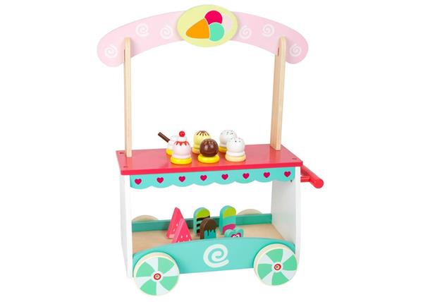 ijskar (afm. 32 x 20 x 50 cm, werkhoogte 23 cm) 12 houten ijsjes