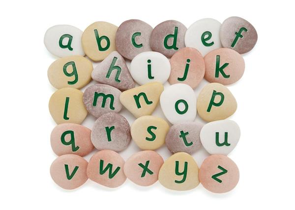 Set van 26 grote alfabet stenen uit hars/steen mix in script letters. Hierdoor kan je de alfabet stenen verstoppen in zand, water, gras, aarde,... Maar je kan ze ook invriezen in water! Op deze manier wordt het leren van de letters nog veel leuker.