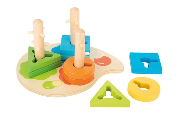 Een felgekleurd motorisch spel! Jonge kunstenaars proberen de houten geometrische vormen (cirkel, vierkant en driehoek) te sorteren op de juiste verfklodder op het palet van de schilder. De vormen moeten zo worden geplaatst dat ze de obstakels op de beweegbare houten palen vermijden. Wie gaat deze uitdaging aan?