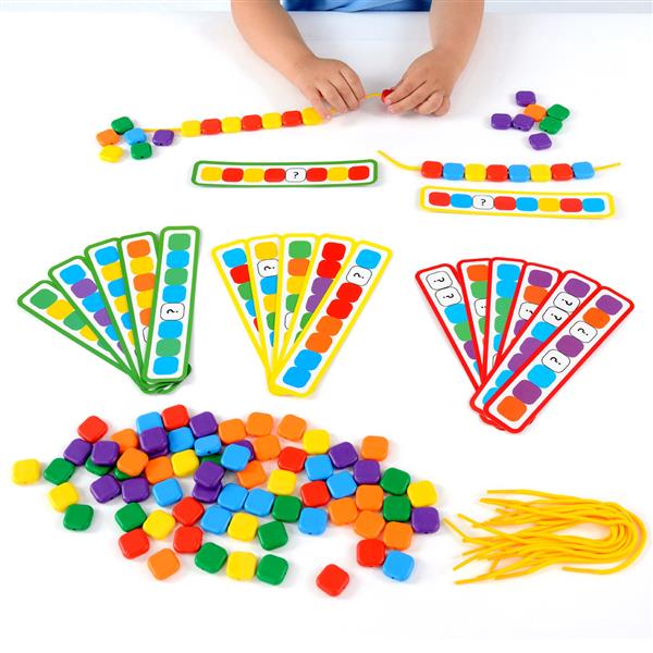 Spel met betrekking tot ruimtelijke oriëntatie en fijne motoriek. De kinderen rijgen de gekleurde vormen op het touw op basis van opdrachtkaarten. Met dit spel kan er aan patroonherkenning gewerkt worden. Aan de opdrachtkaarten is een kleurcode toegevoegd om de moeilijkheidsgraad aan te tonen. Inclusief 96 gekleurde vormen, 12 veters en 18 opdrachtkaarten. Differentiatie is geïntegreerd in de 18 dubbelzijdige opdrachtkaarten (zelfcontrole).