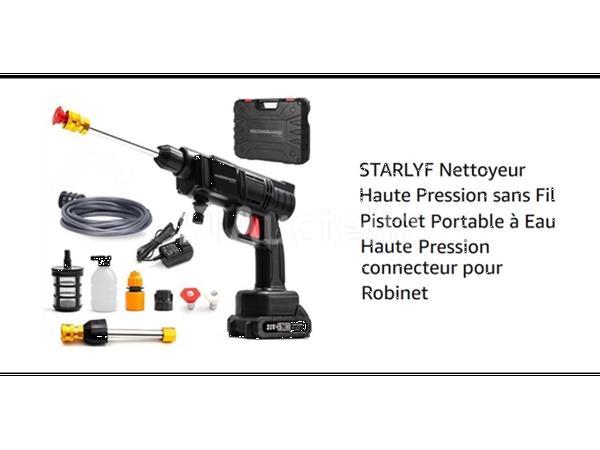 Krachtige draadloze hogedrukreiniger Merk: STARLYF Geleverd met 1 batterij en accessoires (zie foto's) Bereik: 10 m Conditie: Nieuw Verzending: Tarief A