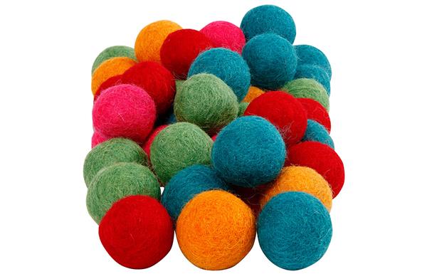 Zakje met 64 wolkralen, ook viltballetjes genoemd in  5 verschillende kleuren. Te gebruiken bij verschillende activiteiten zoals tellen, sorteren, patronen maken. Je kan ze ook aan een draad rijgen met behulp van een naald.