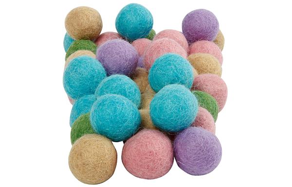 Zakje met 64 wolkralen, ook viltballetjes genoemd in 5 verschillende pastelkleuren. Te gebruiken bij verschillende activiteiten zoals tellen, sorteren, patronen maken. Je kan ze ook aan een draad rijgen met behulp van een naald.