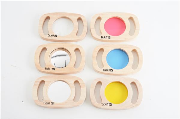 6 verschillende lenzen (roze, blauw, geel, vergrootglas, spiegel, convex/concaaf spiegel) om door of in te kijken en zo de wereld om je heen anders te bekijken en te ontdekken. De lenzen zijn gemaakt uit rubberhout en zijn door hun ontwerp gemakkelijk vast te houden met 2 handen. Deze set is dus uitermate geschikt voor zowel heel jonge kinderen als oudere.
