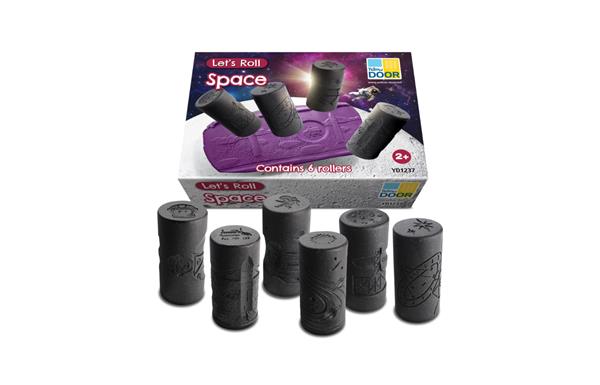 6-delige set met rollers in thema 'De ruimte'. (helm en astronaut, maanrover en maanlandschap, de maan en raketlancering, de zon en het zonnestelsel, ruimtewandeling en capsule, en sterren en telescoop) (afm. 7,5 x 3,5 cm)