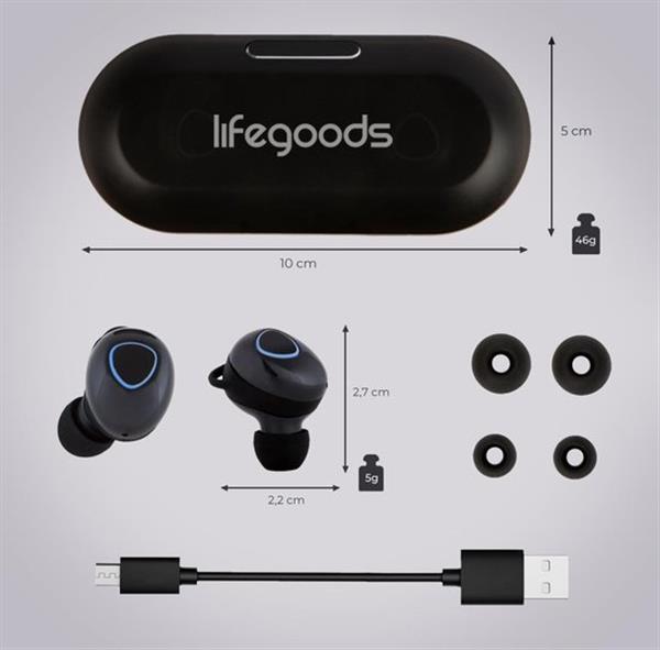 Maak kennis met de volledig draadloze LifeGoods Wireless Earbuds. Deze krachtpatsers gaan 3 tot 4 uur mee. De ultra-lichte oplaadcase (46,5 g) heeft een accu die goed is voor 64 uur luisterplezier! De oortjes kunnen tegen regen of zweet van intensief sporten. Zelfs met hardlopen blijven de lichtgewicht oortjes (5,2 g) goed zitten. De earbuds hebben microfoons in beide oortjes en een multifunctie knop voor handsfree bellen.