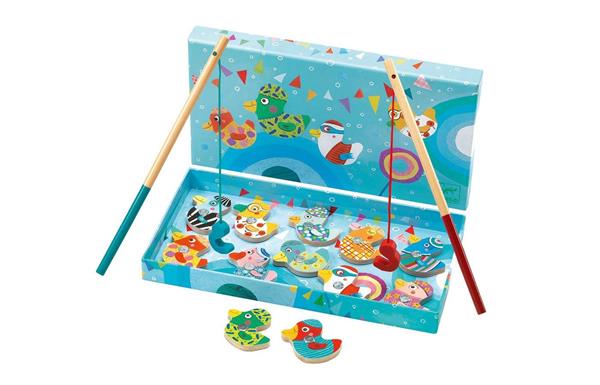 Klaar om te gaan vissen? Deze set bevat 12 houten eenden, 2 hengels en een mooie doos die verandert in een vijver. Kinderen gebruiken de hengels om de magnetische houten eendjes met te vangen. De reis kan beginnen!