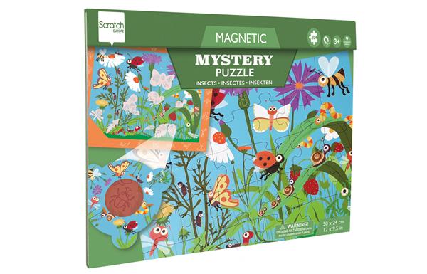 Prachtige magnetische puzzel van 30 stukken in thema 'insecten'. De puzzel is gemaakt van dik karton en zit in een vrolijke stevige doos. Als je klaar bent met puzzelen, kan je als een echte detective op zoek gaan naar de voorwerpen die verstopt zitten. Wat je allemaal kan zoeken, staat afgebeeld op de rand van de puzzel.