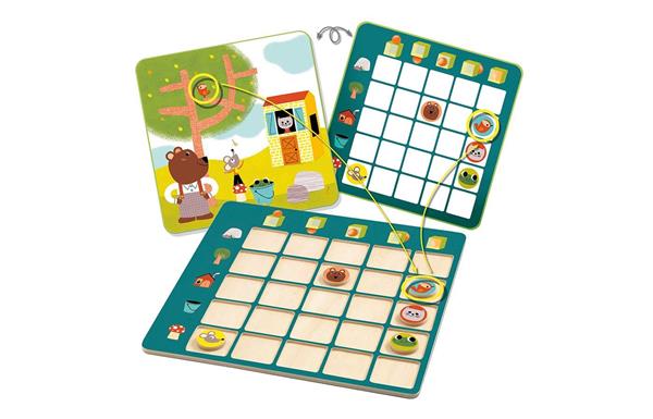 Kijk op de opdrachtkaart en vind de positie van de 5 dieren in verhouding tot de 5 voorwerpen, bijvoorbeeld de kikker zit in de emmer. Leg daarna het dier op de juiste plaats in de houten matrix en controleer op de achterzijde of je het juist hebt gedaan. Een eenvoudig, grappig spel om te oefenen op ruimtelijke oriëntatie maar ook bijvoorbeeld om zinsbouw te oefenen.
