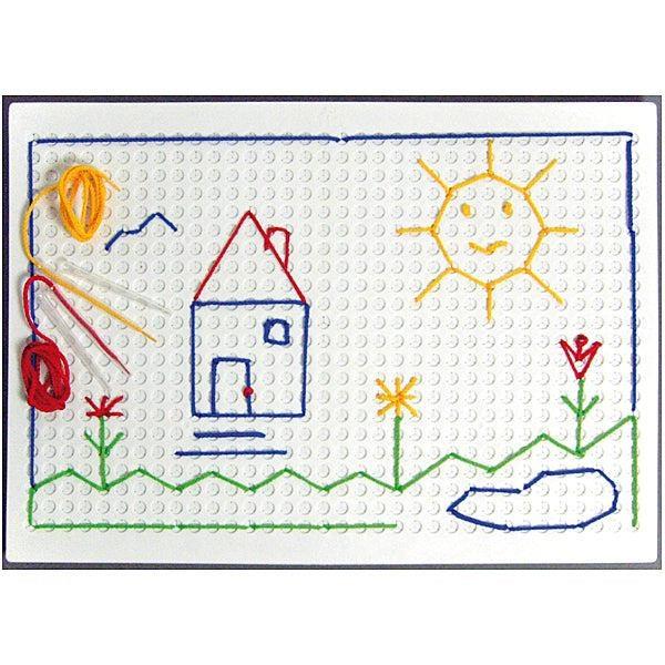 Op dit mega rijgbord kunnen kinderen hun creativiteit de vrije loop laten. Met behulp van de rijgpennen kunnen kinderen de touwen vast in de gaten steken. Zo zal er een tekening ontstaan. De kruisgaten houden de touwen vast en kunnen later weer los gemaakt worden. Dit spel bevordert zowel de concentratie als de coördinatie van oog en handen.