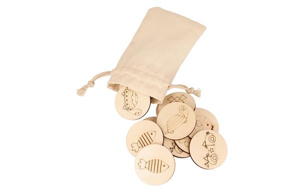 Memory met 24 houten gegraveerde schijven met een diameter van 5 cm. Kan jij steeds 2 dezelfde prenten vinden?