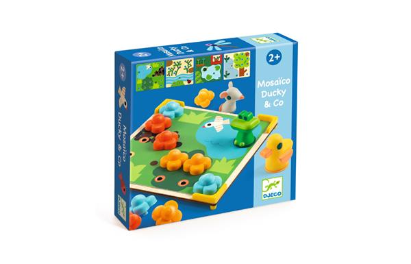 Met deze mozaïek puzzel Mosaïco Ducky & Co maken jonge kinderen kleine tafereeltjes van bloemen en dieren. Leg één van de sjablonen op de houten plank en plaats de bloemen en dieren met de nopjes op de juiste plaats. De kleuren van de bloemen en dieren staan reeds aangegeven op de sjablonen om zo kinderen op weg te helpen in hun zoektocht. Deze mozaïek puzzel is creatief speelgoed dat bijdraagt tot de ontwikkeling van kleur- en dierherkenning.