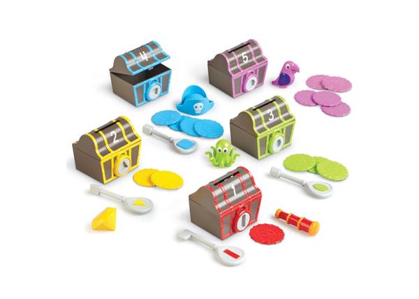 Ontgrendel de 5 genummerde schatkisten met de passende sleutel en ontdek de schat. De kinderen kunnen een paarse papegaai, een groene octopus, een rode verrekijker, een gele edelsteen en een blauwe piratenhoed ontdekken. De set bevat ook munten die kunnen helpen bij het tellen en sorteren. De munten kunnen door de gleuf in het deksel van de schatkist in de schatkist gestopt worden. Kan jij de schat ontdekken?