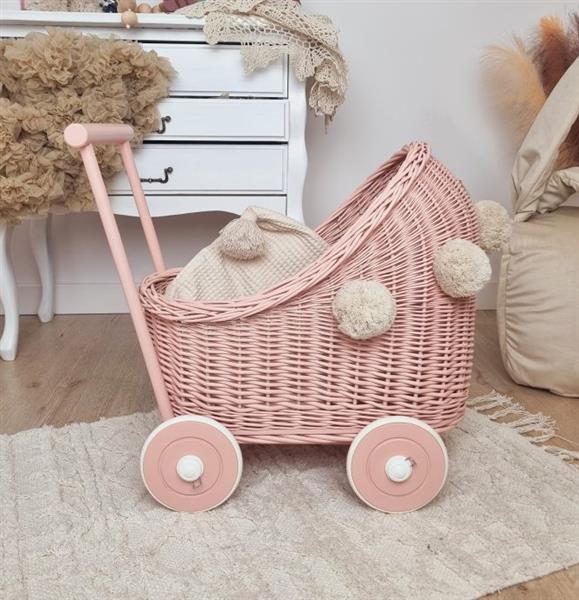 Ontdek onze met liefde handgemaakte poppenwagen in roze, met houten onderstel en zachte pompons.