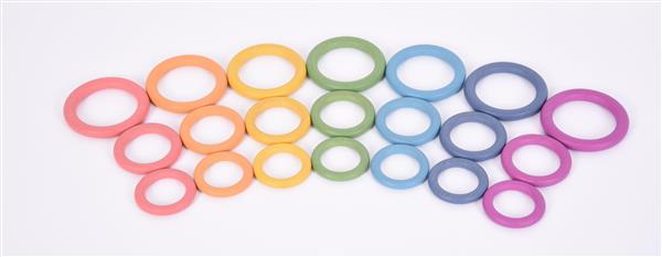 set van 21 houten ringen in regenboogkleuren (afm. grootste: 7 cm)