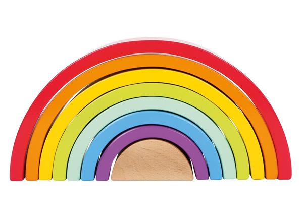 Grote houten regenboog met 8 bogen en 1 houten bal. Bouw een stevige constructie, leg patronen, leg van klein naar groot, bouw bruggen en tunnels voor je auto's,... kortom eindeloos veel mogelijkheden met deze grote regenboog!