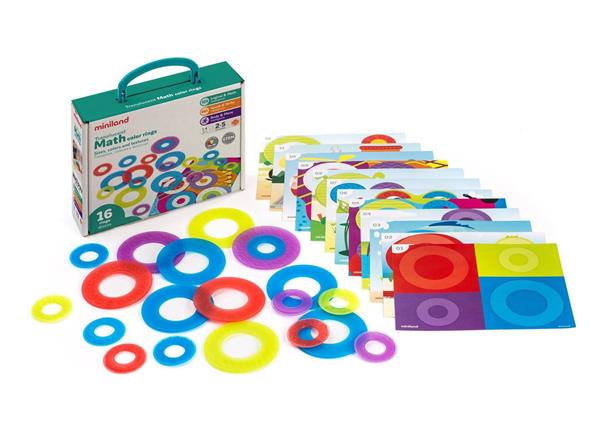 Doorzichtige gekleurde ringen. Een set van 16 doorzichtige ringen en 12 opdrachtkaarten. De opdrachtkaarten zijn opgebouwd in verschillende thema's en verschillende moeilijkheidsgraad. De ringen hebben 4 verschillende kleuren en 2 groottes. Dit artikel is zeer geschikt om te gebruiken op de lichttafel.