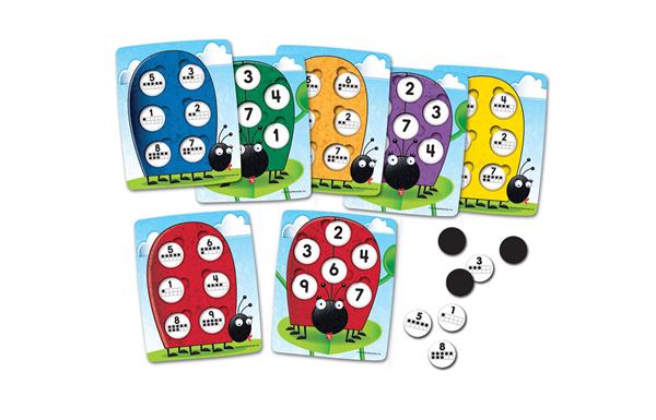 Moedig kinderen aan om tien te maken met dit spel in bingostijl. De spelkaarten hebben aan de ene kant 10-frames, aan de andere kant gewoon getallen. Elke speler neemt een spelbord met lieveheersbeestjes. De zwarte stippen worden in het midden van de tafel gelegd met de zwarte kant naar boven. Draai de stip om en probeer 10 te vormen met één van de getallen op je spelkaart.