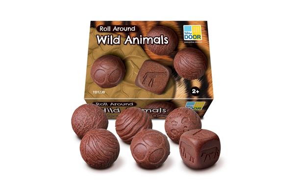 6-delige set met 5 rollers en 1 dobbelsteen met wilde dieren. (giraf, zebra, tijger, luipaard en olifant) (afm. 4,5 cm)