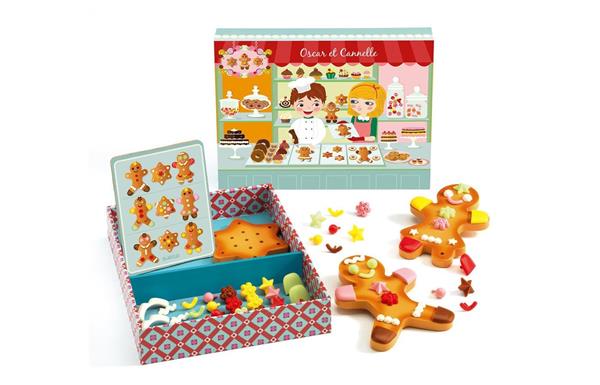 3 houten koekjes (2 peperkoekmannetjes en 1 ster) 65 decoratieve pinnen 1 voorbeeldkaart 1 houten opbergkist