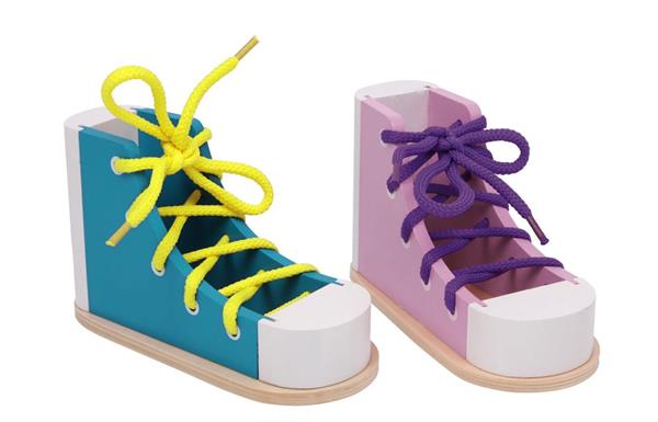 Met deze houten rijgschoenen kunnen kinderen spelenderwijs leren veters te strikken.
