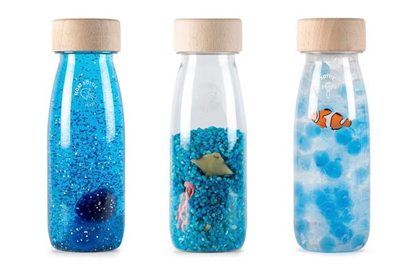 1 sensorische Float Bottle - blauw (afm. 15,5 x 4,5 cm) 1 sensorische Spy Bottle - zee (afm. 15,5 x 4,5 cm) 1 sensorische Sound Bottle - vis (afm. 15,5 x 4,5 cm)