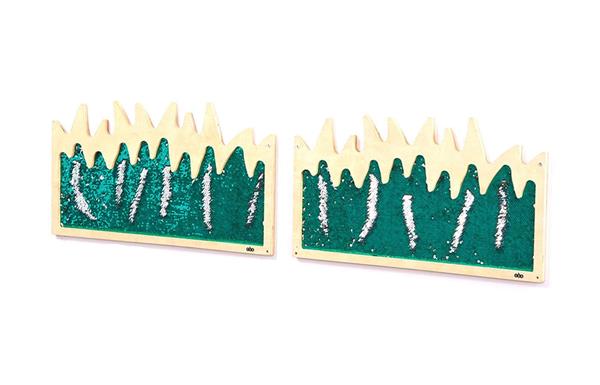 Set van 2 sensorische muurborden met gras. Het gras bestaat uit paillettenstof in een houten frame. De borden stimuleren de nieuwsgierigheid en ondersteunen de motoriek. Door de grassen te aaien, veranderen ze van kleur. Een mooie toevoeging aan muren, gangen, sensorische snoezelhoekjes en meer. De borden hebben een rustgevend, kalmerend effect op de kinderen door het voelen aan de fascinerende texturen en het glinsteren van de pailletten. Leuk in combinatie met de sensorische dinosaurus muurborden.