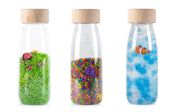 Dit ECO Pack bevat 3 sensorische sound bottles, namelijk de fles met lieveheersbeestjes, de fles met knopen en de fles met de anemoonvis.