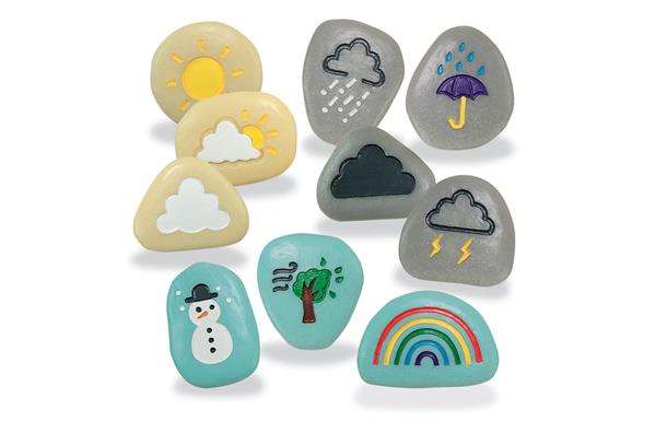 Set van 10 sensorische stenen uit hars/steen mix met weersvoorspellingen. Hierdoor kan je de stenen verstoppen in zand, water, gras, aarde,... maar ze ook invriezen in water! De set bevat 10 stenen die gegraveerd en beschilderd zijn met de volgende afbeeldingen: donkere wolk, lichte wolk, hagel, regen, regenboog, sneeuw, zon, zonnige perioden, onweer en wind. Elke steen is tussen 4 en 5,5 cm groot. Ze kunnen op tal van manieren worden gebruikt, waaronder het waarnemen van het weer, het maken van een voorspelling, het sorteren op de verschillende omstandigheden, het indrukken van de stenen in klei of speeldeeg of het maken van verhalen naast andere sensory play stenen.