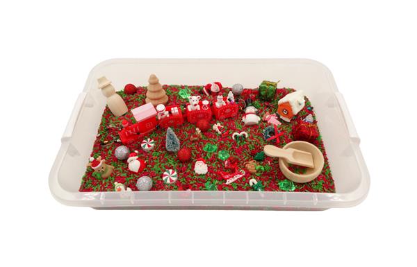 Sensory Play Tray - Kerstmis - speelrijst: - plastic box met deksel (afm. 27 x 35 x 9 cm) - 1 kg groene en rode speelrijst - 1 houten scooper - 1 houten kommetje - 1 houten kerstboom - 1 houten sneeuwman - 1 kersttreintje - 1 kerstbeer - 1 sneeuwman - 2 papieren kerstpakjes (rood + groen) - 1 kerstboompje - 1 kerstkrans - 15 kerstfiguurtjes - 10 rode en groene transparante stenen - 1 lichtslinger - 6 rode en zilveren piepschuim balletjes - 1 kersthuisje