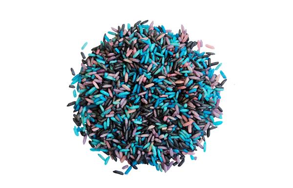 voorraadpot van 750 gram speelrijst. (keuze uit geel, blauw, groen, rood, oranje, oceaan mix, Kerstmis mix, pastel mix of ruimte mix )