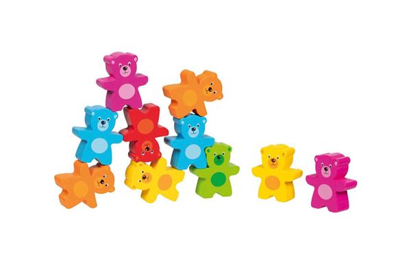Deze mooie collectie van 18 houten kleurrijke beren is ideaal om mee te spelen of om te stapelen. Kan jij de hoogste toren maken?
