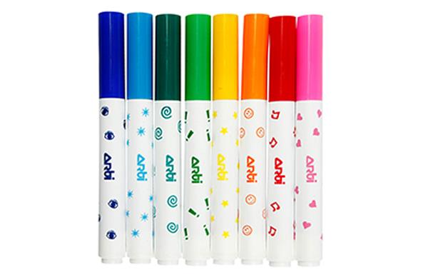 Stempelstiften op waterbasis met afbeeldingen op de punten van de stiften om grappige stempeleffecten te krijgen.