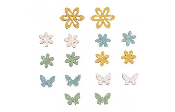 Een zakje met 16 houten figuurtjes, 10 bloemen en 6 vlinders in mooie zachte kleuren. De achterzijde is zelfklevend, verwijder eenvoudig de folie en kleef ze op de gewenste plek. Te gebruiken als decoratie of om mee te knutselen.