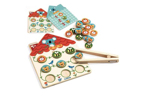 Dit leuke tel- en behendigheidsspel is een interessante uitdaging! Pak een kaartje en kijk welke opdracht de koala jou geeft, leg dan met de pincet de juiste fiches op het spelbord. Draai de opdrachtkaart om en zie of je het goed hebt gedaan! Dit spel stimuleert de motorische vaardigheden van kinderen en de oefent op kleur- en vormherkenning.
